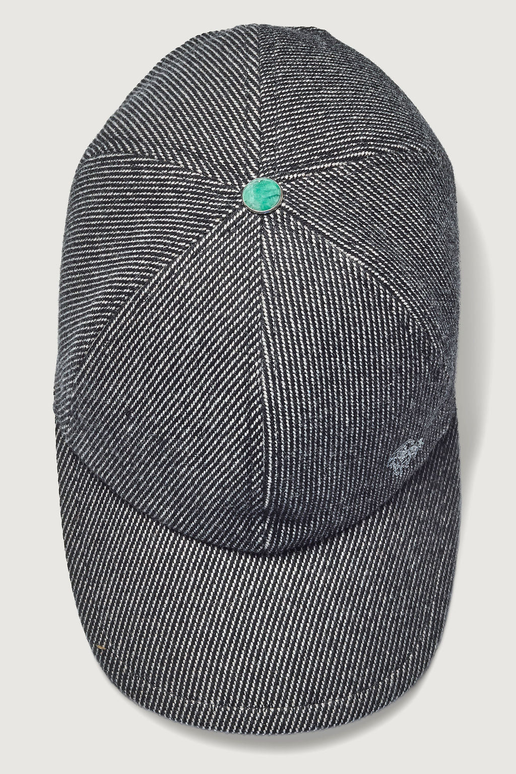 A Malachite gemstone, associated with transformation and clarity, has been thoughtfully placed on the hat to carry a quiet, grounded strength.