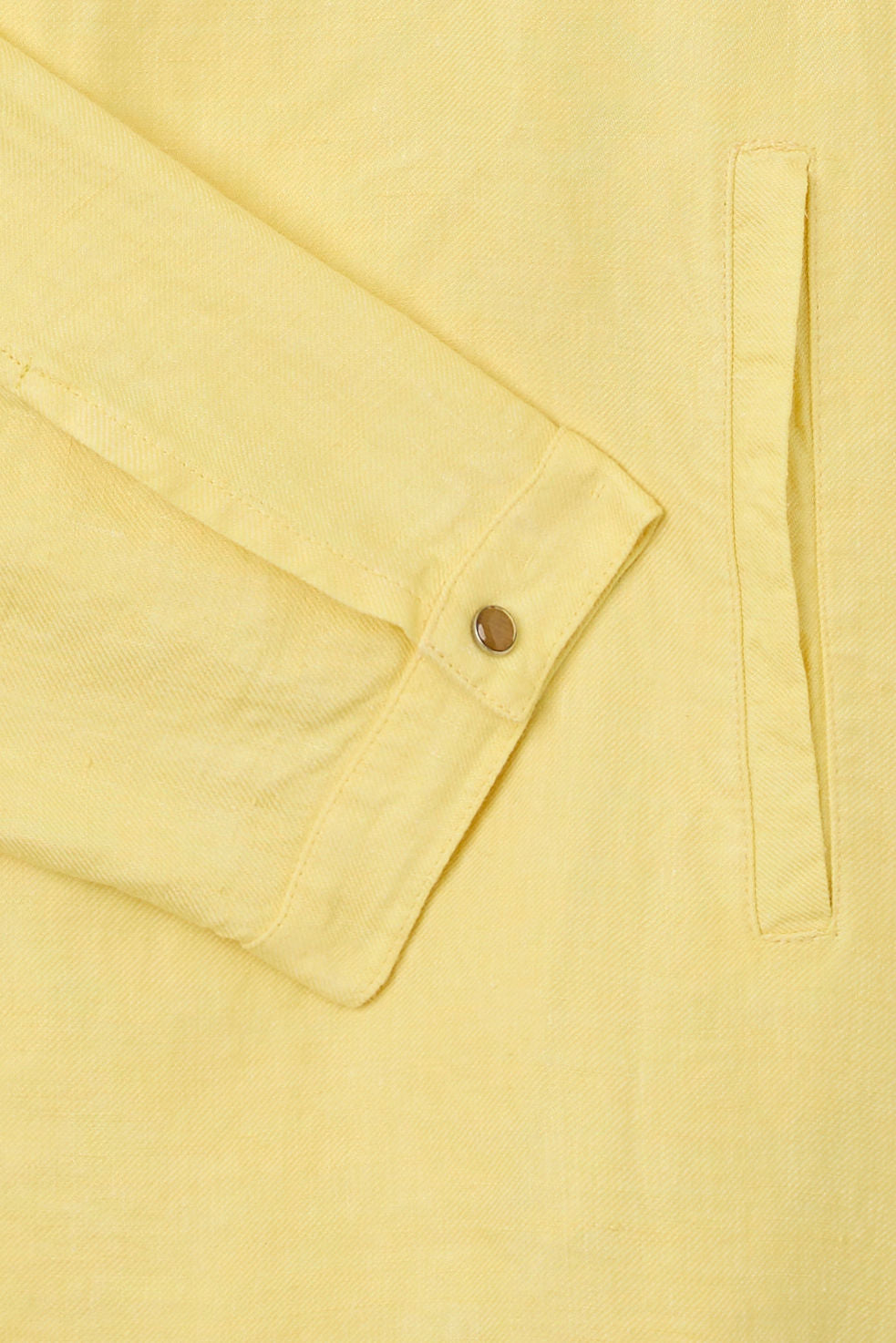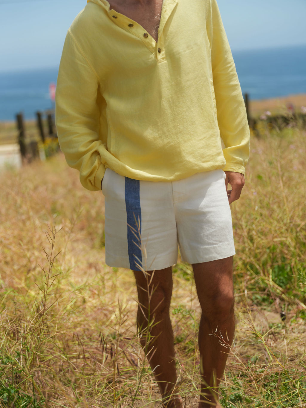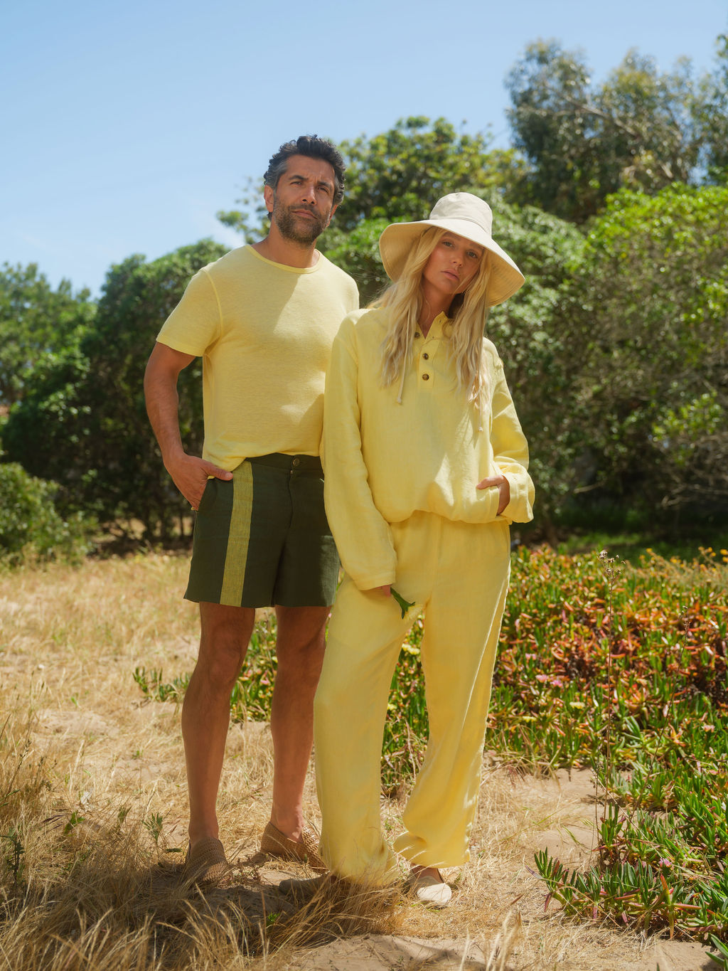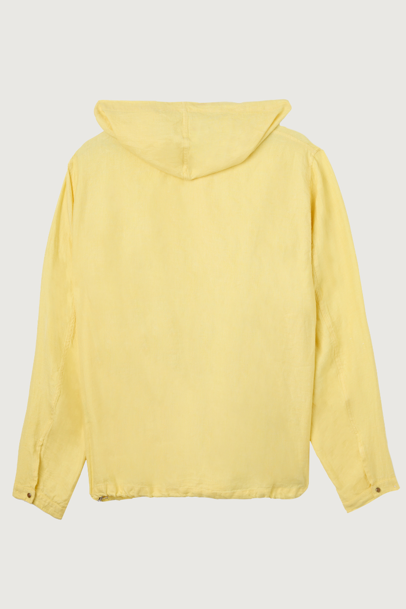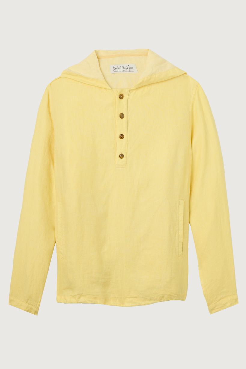 Summer butter yellow was a natural choice for our linen anorak. Made with 100% linen the anorak is a unisex design with elasticated cuffs and waist for a relaxed look. The natural linen from Europe will wrap you in coolness to enjoy the unique combination of crisp yet softness. The hood ensures you are ready for when the weather cools and you need an extra layer.
