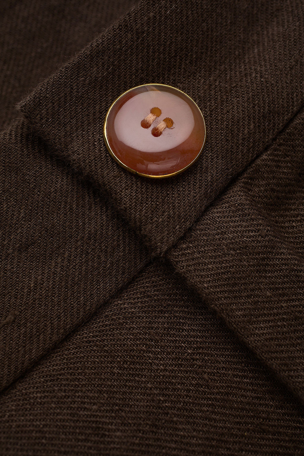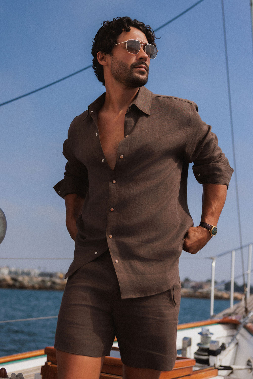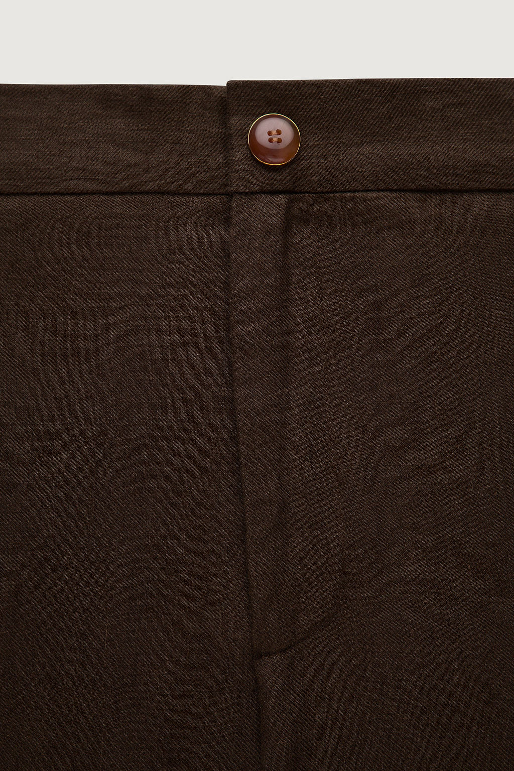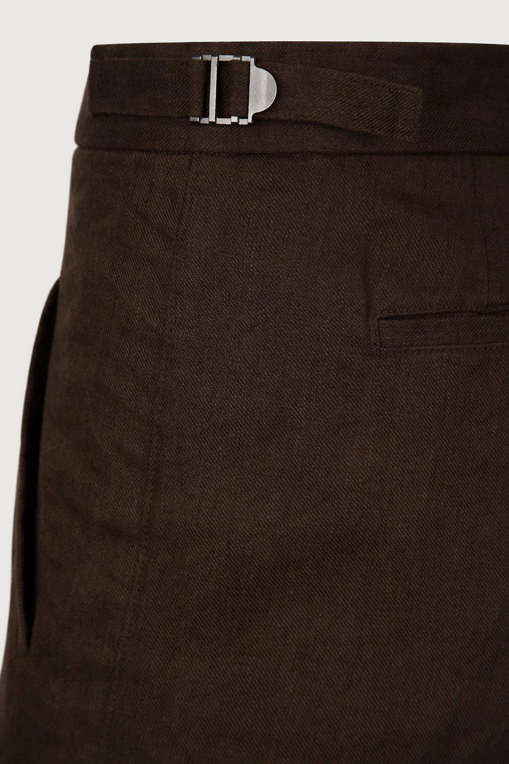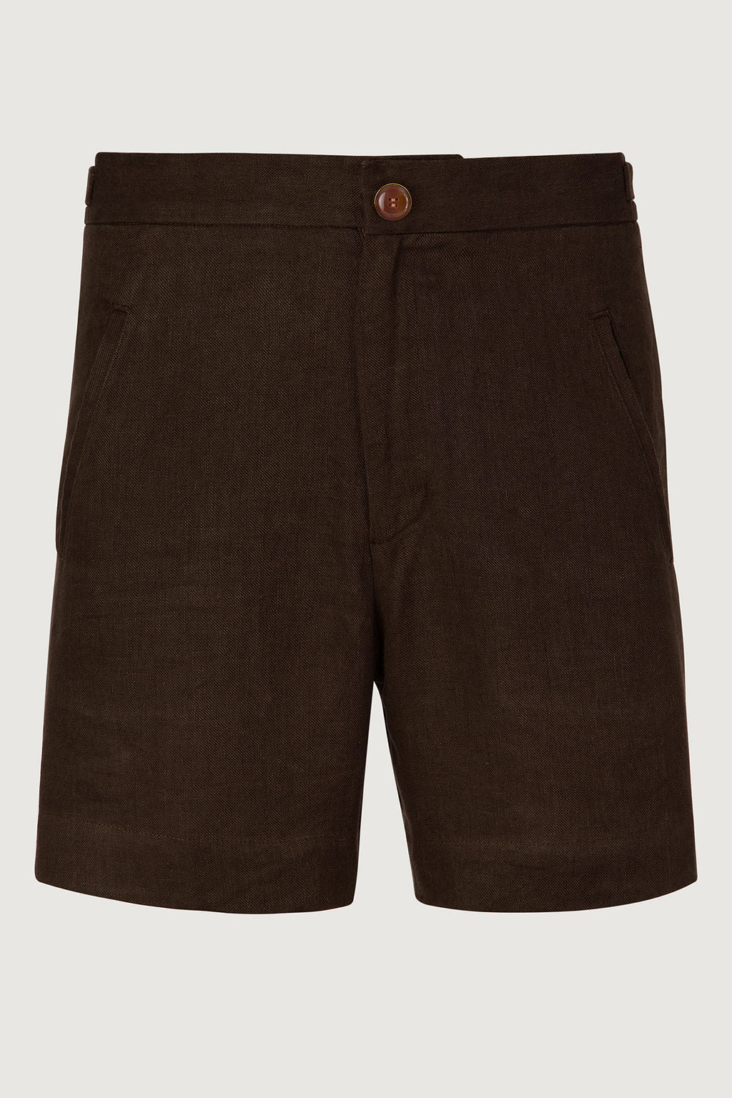 A deep warm cocoa 100% linen short. Formally made in Italy in a unisex design, featuring an adjustable waist with metal buckles and handy pockets.