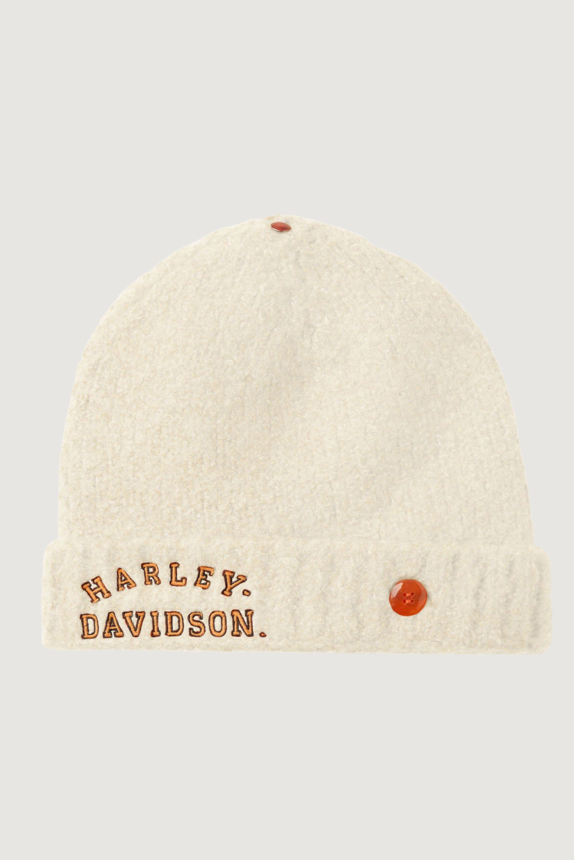 Our cashmere boucle knit beanie is chunky, warm and soft. With the H-D logo on the hem of this ivory beanie and Carnelian hand cut gemstone in striking orange known for its properties of courage and vitality. This beanie is a nod to the iconic Harley-Davidson brand paired with softness and comfort.