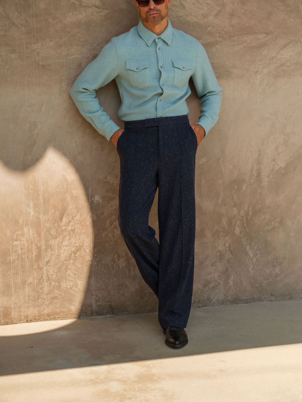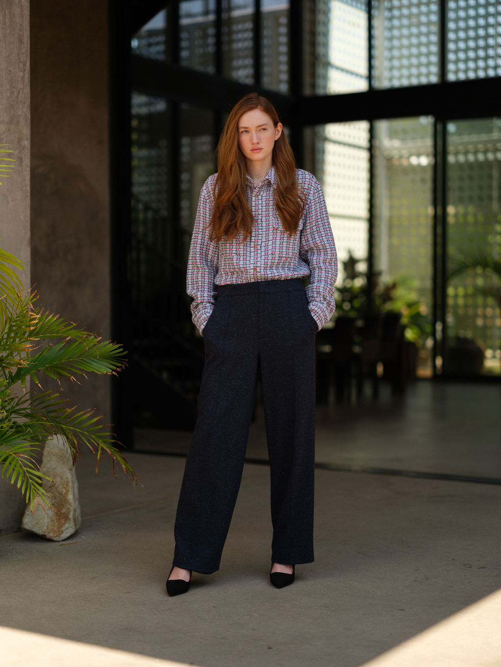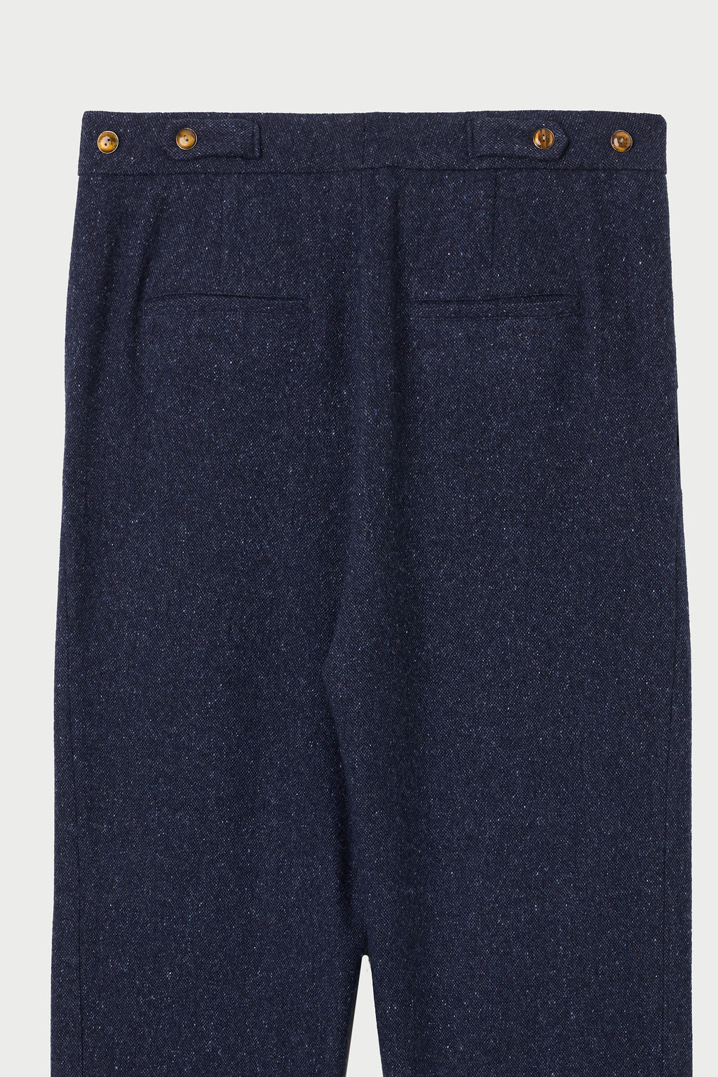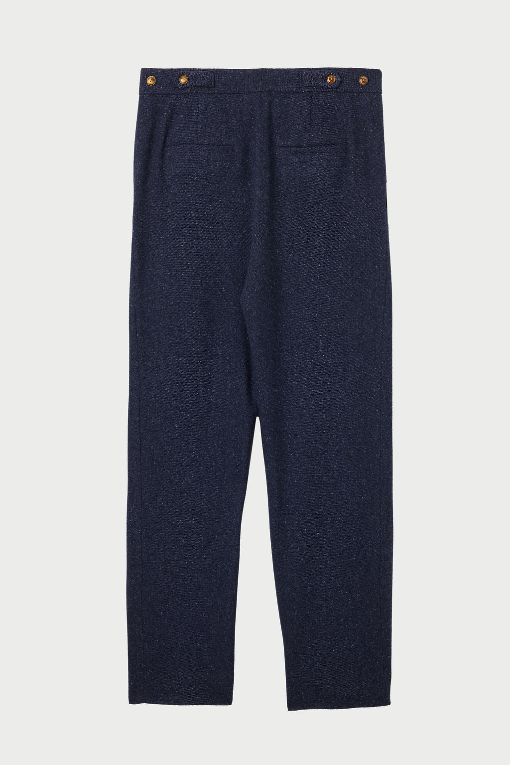 The Donegal pant is a straight leg with pin-tucks to elongate the leg line. The waist band features a hand carved gemstone button and adjustable waist tabs.
