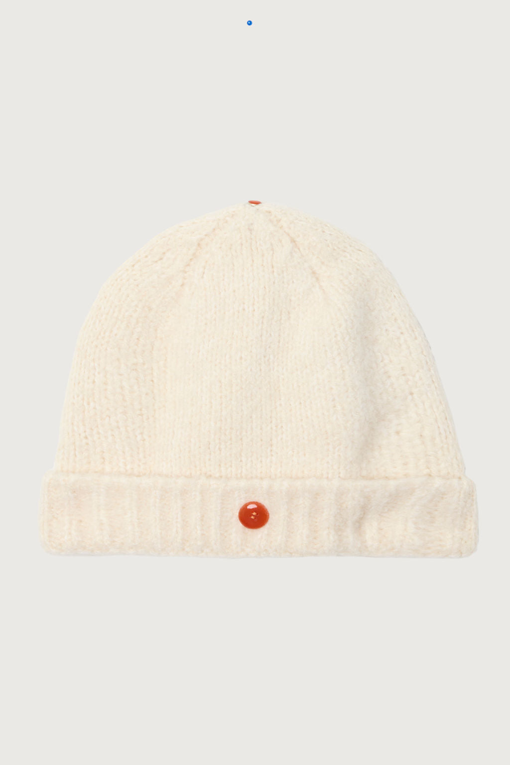 100% Cashmere yarn with a ribbed construction and cloud like hand feel. Embellished with a hand cut semi-precious button
