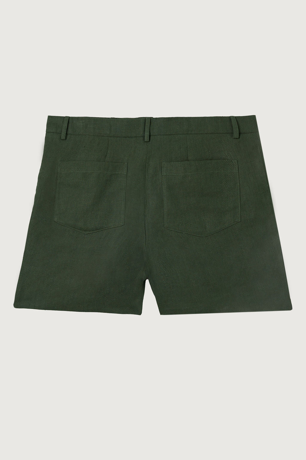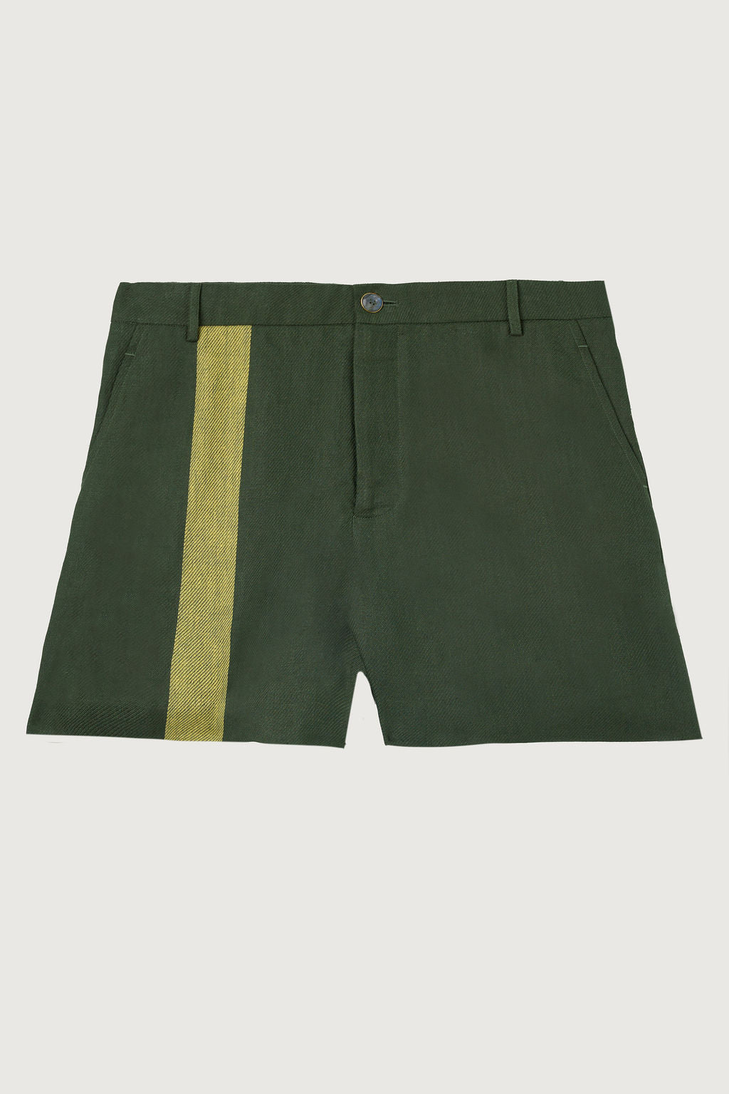 Dress lightly for warm weather in these unisex linen shorts in a striking spruce green with a yellow racer stripe. Made in Italy with 100% European linen the shorts are a sustainable choice with a relaxed naturally keeping you cool in the warm weather.