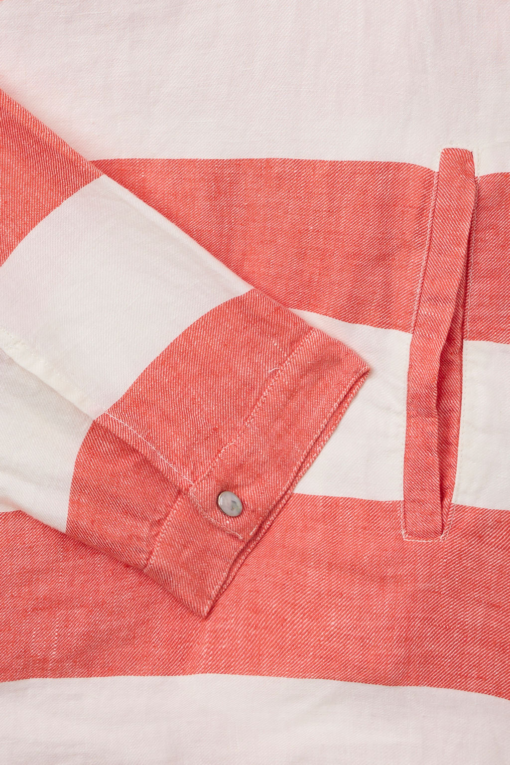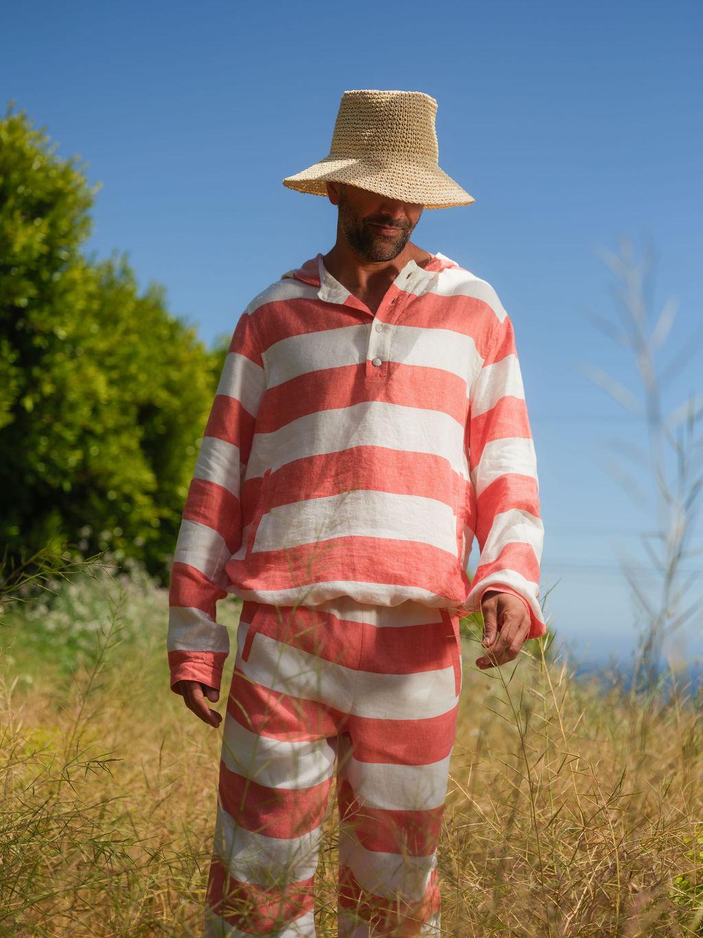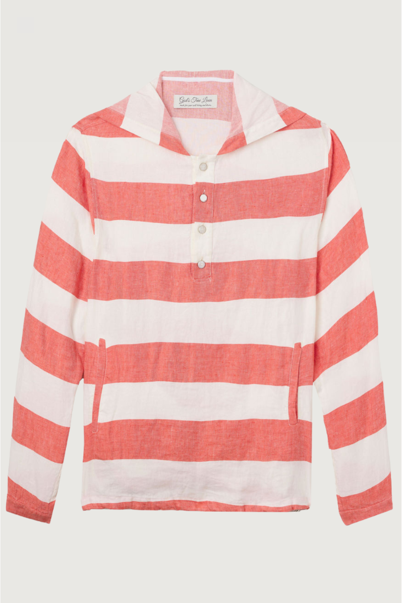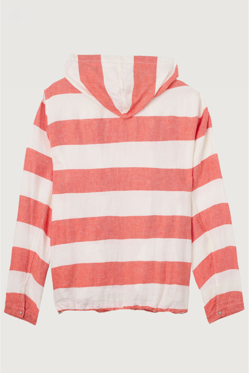 The unisex design by the founders has striking tomato colored stripes and has an elasticated waist and sleeves for ultimate comfort. Made with 100% European linen and tailored in Italy the anorak maintains a cool and fresh summer style.