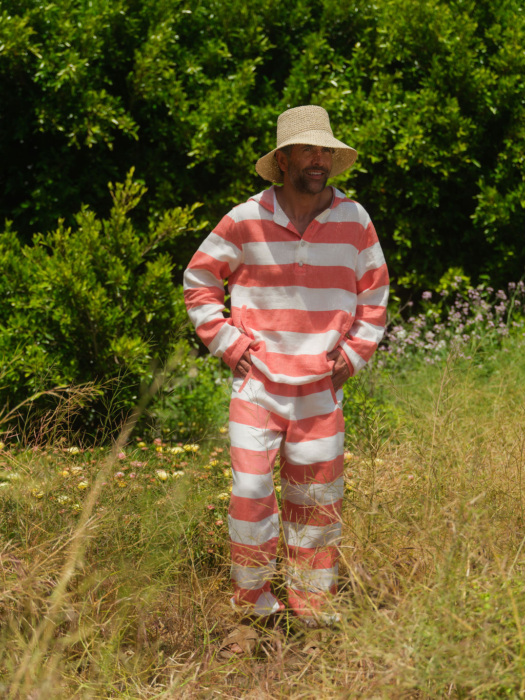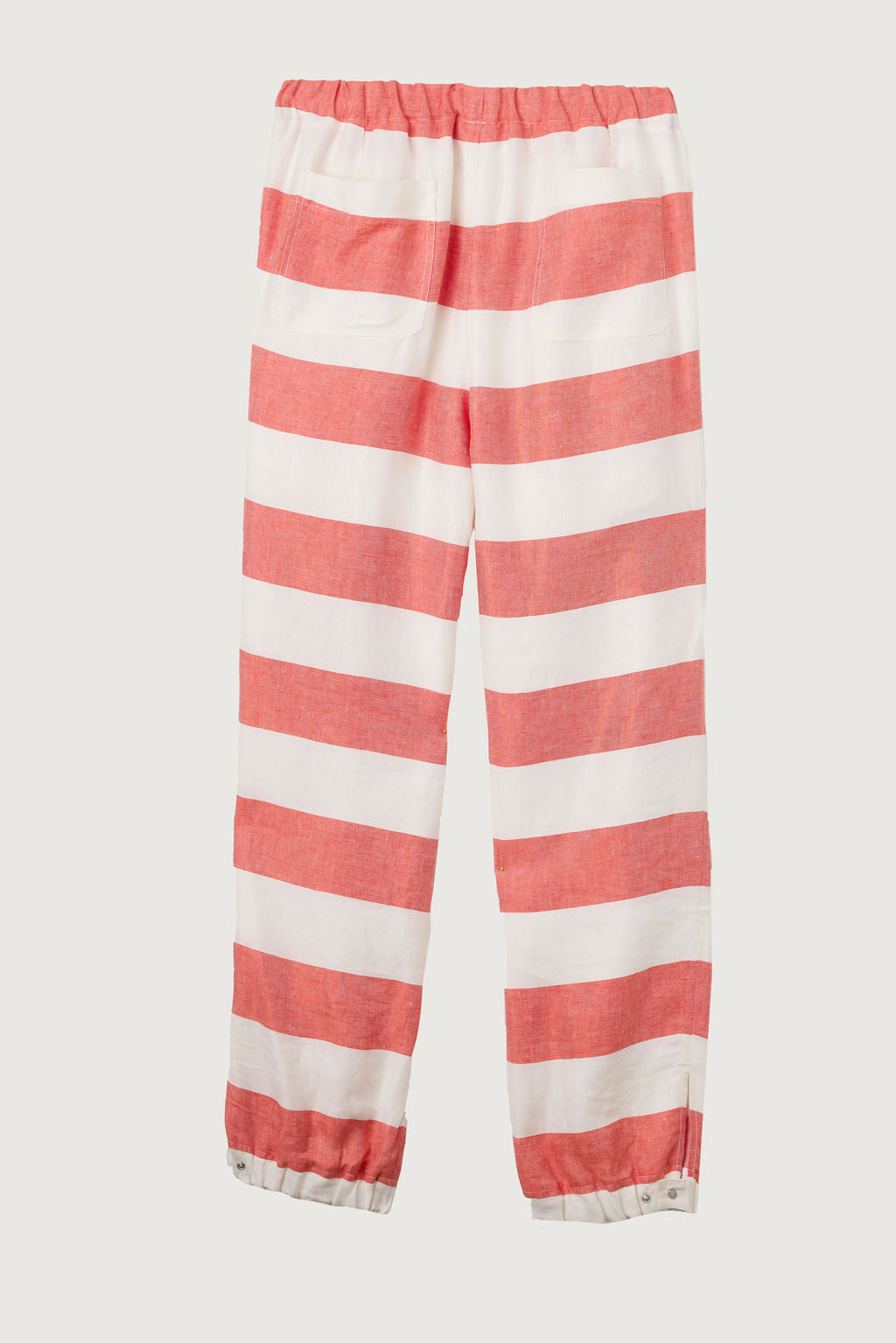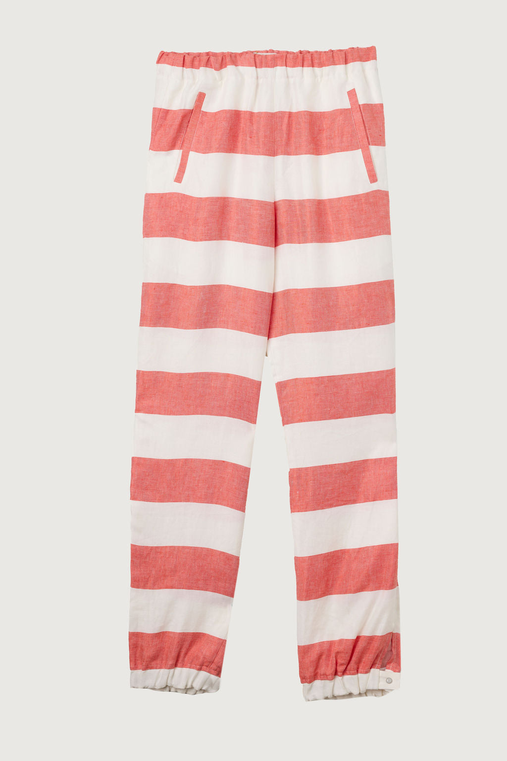 A fun striking linen pant with tomato stripes adds a pop of colour to your summer wardrobe.